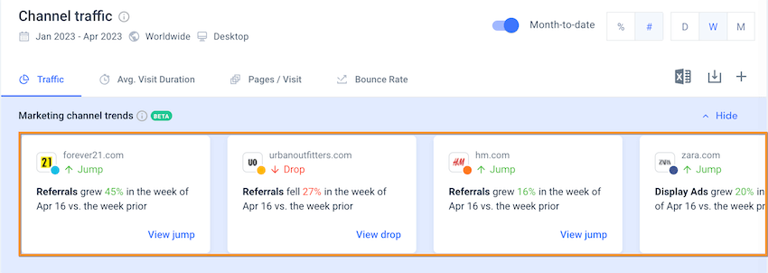 For example, you can quickly track fluctuations and spot traffic trends across your competitor’s key marketing channels.