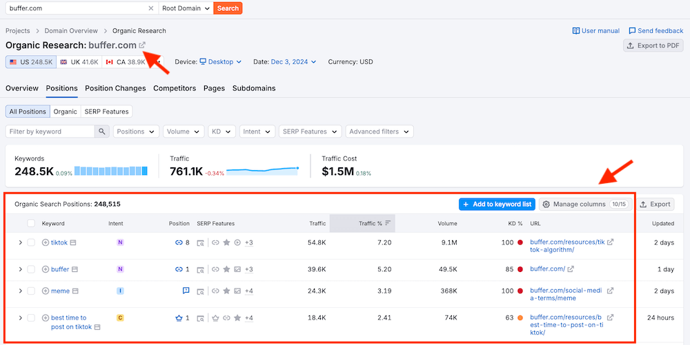 You just need to enter a competitor’s domain to uncover the keywords they rank for, their positions, and the estimated organic traffic they generate for each keyword.