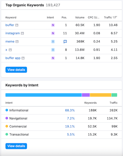 With the Domain Overview tool, you can compare multiple domains side-by-side, analyzing traffic trends, top-performing keywords, backlink profiles, and keyword intent.